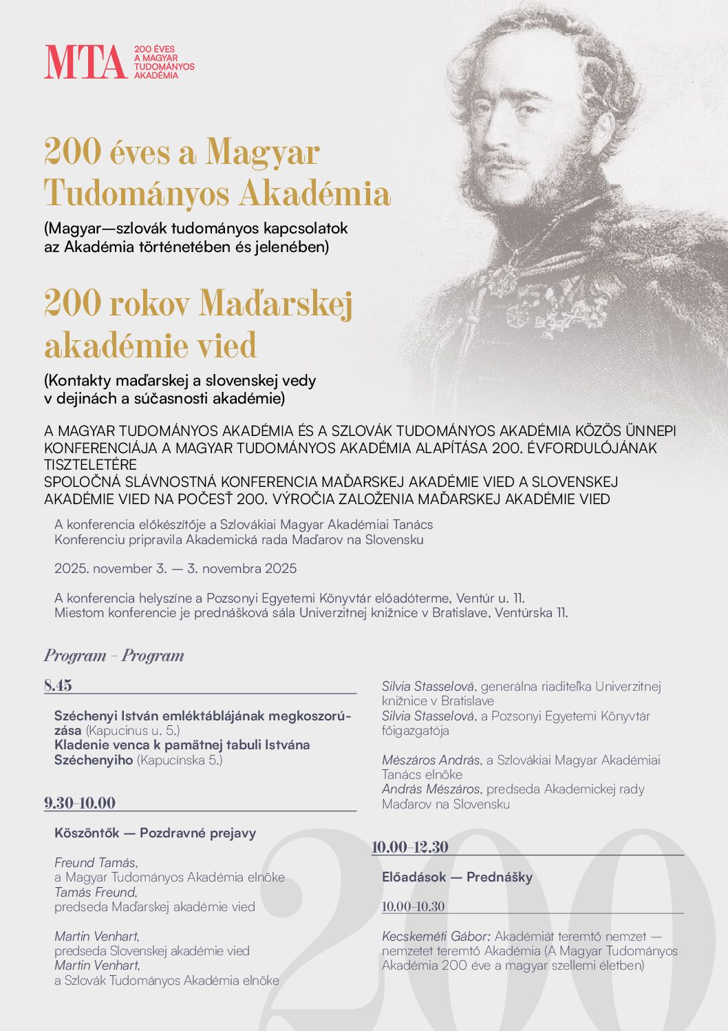 Presne 200 rokov po tom, čo István Széchenyi venoval svoj ročný príjem na založenie maďarskej učenej spoločnosti, sa v budove Univerzitnej knižnice v Bratislave, na mieste niekdajšieho sídla uhorského snemu, konala spoločná slávnostná konferencia MTA a SAV na počesť 200. výročia založenia Maďarskej akadémie vied. Podujatie bolo venované téme Kontakty maďarskej a slovenskej vedy v dejinách a súčasnosti akadémie.