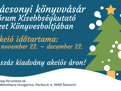 A könyvesboltunkban (eshop.foruminst.sk) november 22. és december 22. között több száz kiadványt akciós áron vásárolhatnak meg az érdeklődők. Az akció időtartama: 2019. november 22. – december 22. 40 euró feletti... Bővebben